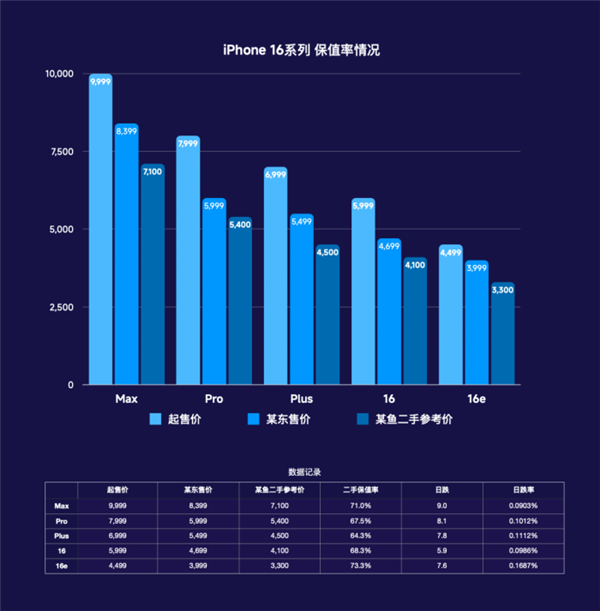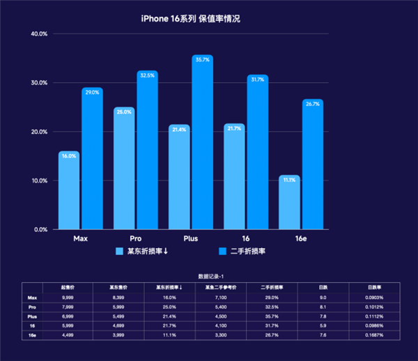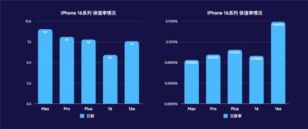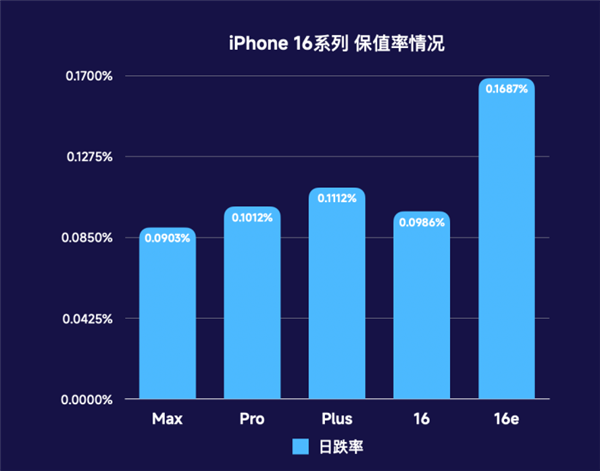 值得注意的是,售价最低的iPhone 16e并未因价格优势带来更低的使用成本。从保值数据来看,iPhone 16e的日均贬值率反而在全系列中排名靠前,其每日跌价占比为0.1687%,远高于其他型号。