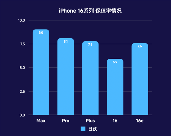 而在二手交易市场,情况略有不同:保值率最高的依旧是Max机型,而折损率最高的则变成了iPhone 16 Plus。其二手平台的折损率排名为:16 Plus>16 Pro>16>16 Pro Max。